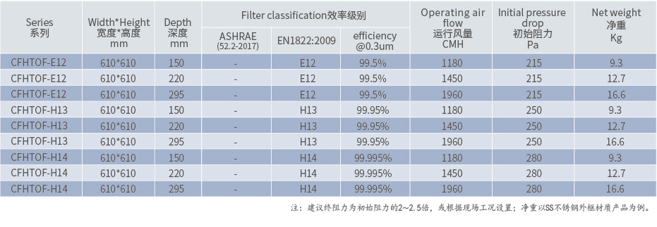 耐高温过滤器CFHTOF,主要运用于制药厂的高温灭菌隧道或者高温烘房生产环节,过滤工况中产生的焦油、煤烟、灰尘等颗粒,按效率等级主要可分为耐高温中效过滤器、耐高温高效过滤器;均选用玻璃纤维滤材,采用铝箔或纸箔为分隔物,过滤器外框多采用不锈钢材料制成,并双面设有护网,整体结构强度高,具有容尘量大、风量大等特点;产品依据EN1822逐台测试,精工品质。为高温工况提供洁净的空气,如:生物制药灭菌隧道、喷涂烤箱等。