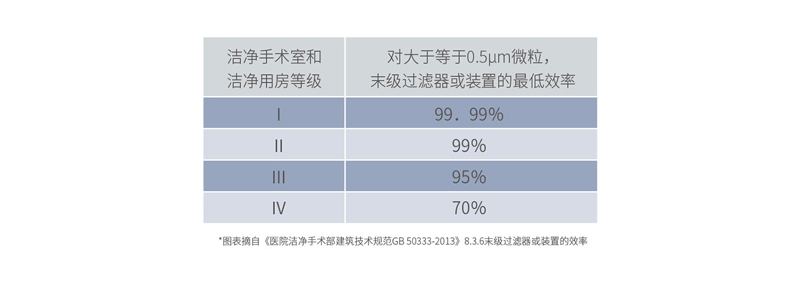中华人民共和国国家标准《医院洁净手术部建筑技术规范GB50333-2013》中对医院手术室、无菌病房、ICU、配置中心等场所都有相应的洁净要求,比如手术室和洁净用房的送风末级过滤器或装置的效率分为左图四个等级。
